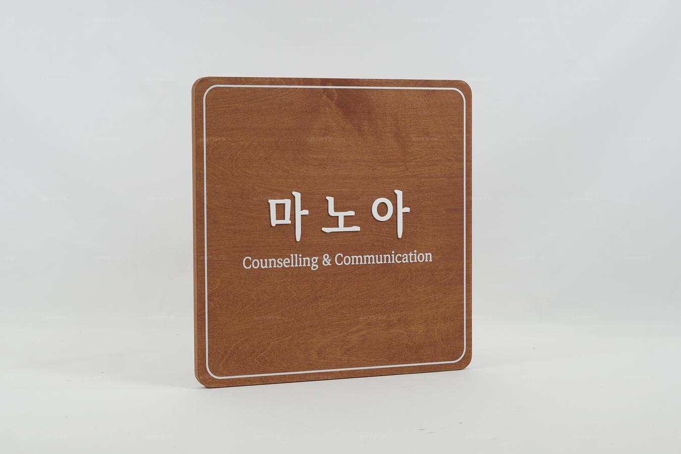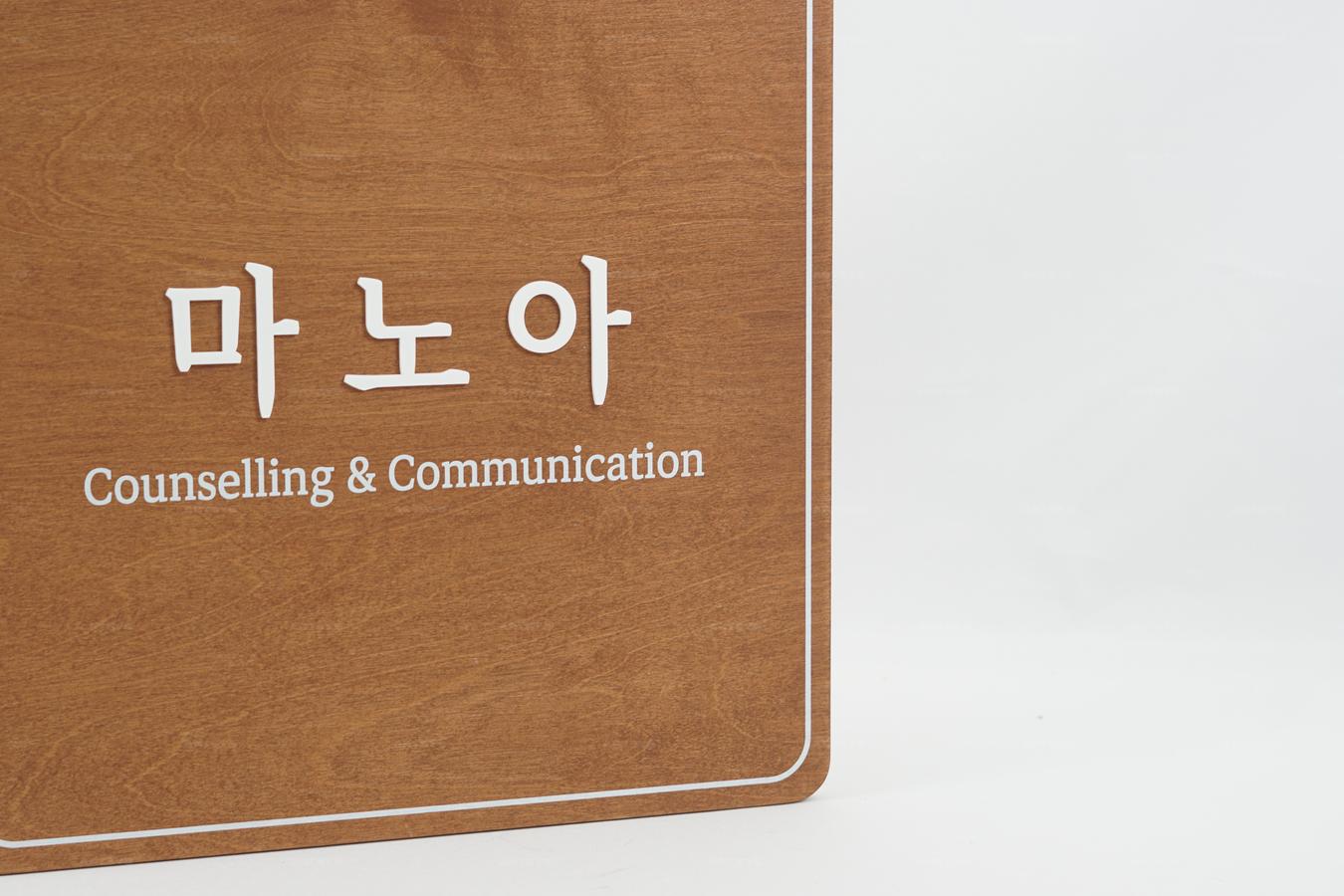 상품 소개 | 이 나무 재질의 간판은 '마노아'라는 이름과 'Counselling & Communication'이라는 문구가 아름답게 새겨져 있습니다. 자연스러운 갈색 톤이 특징이며, 상담 및 커뮤니케이션 서비스를 제공하는 공간에 적합합니다. 고급스러운 디자인으로 고객의 신뢰를 더해줍니다. | ||