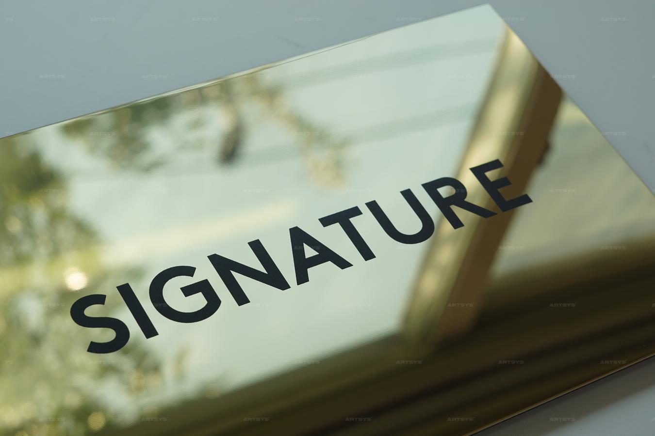 상품 소개 | 이 고급스러운 스테인리스 스틸 골드 미러 사인 보드는 'SIGNATURE'라는 텍스트로 세련된 디자인을 자랑합니다. 미러 마감으로 반짝이는 표면이 돋보이며, 어떤 공간에서도 우아함을 더해줍니다. 비즈니스의 품격을 높이는 데 최적의 선택이 될 것입니다. | ||