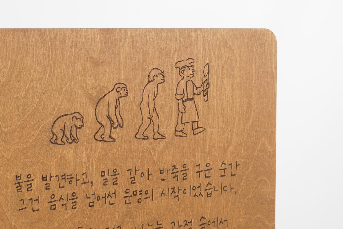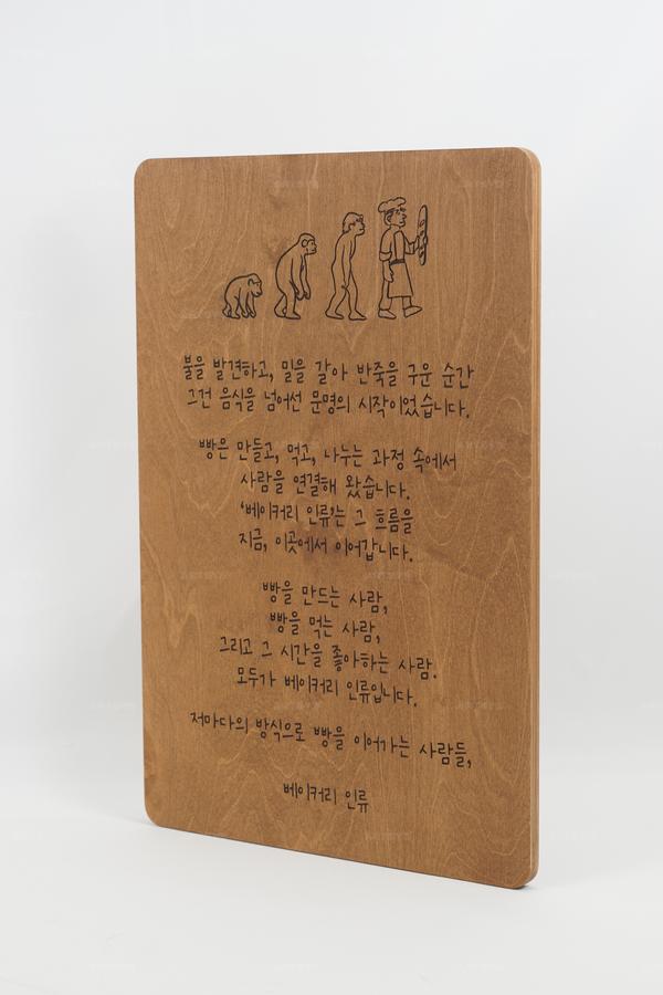 상품 소개 | 이 나무 소재의 안내판은 베이커리 인류의 철학을 담고 있습니다. 갈색의 우드로 제작되어 자연스러운 느낌을 주며, 빵을 만드는 이들과 그 빵을 사랑하는 이들을 연결하는 메시지를 전합니다. 이 안내판은 베이커리 인류의 정체성을 잘 나타내며, 고객에게 따뜻한 감성을 전달합니다. | ||