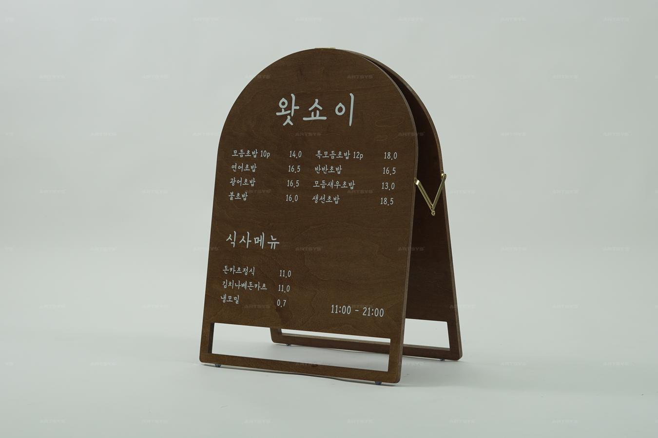 나무 재질의 맛있는 초밥과 식사 메뉴 입간판