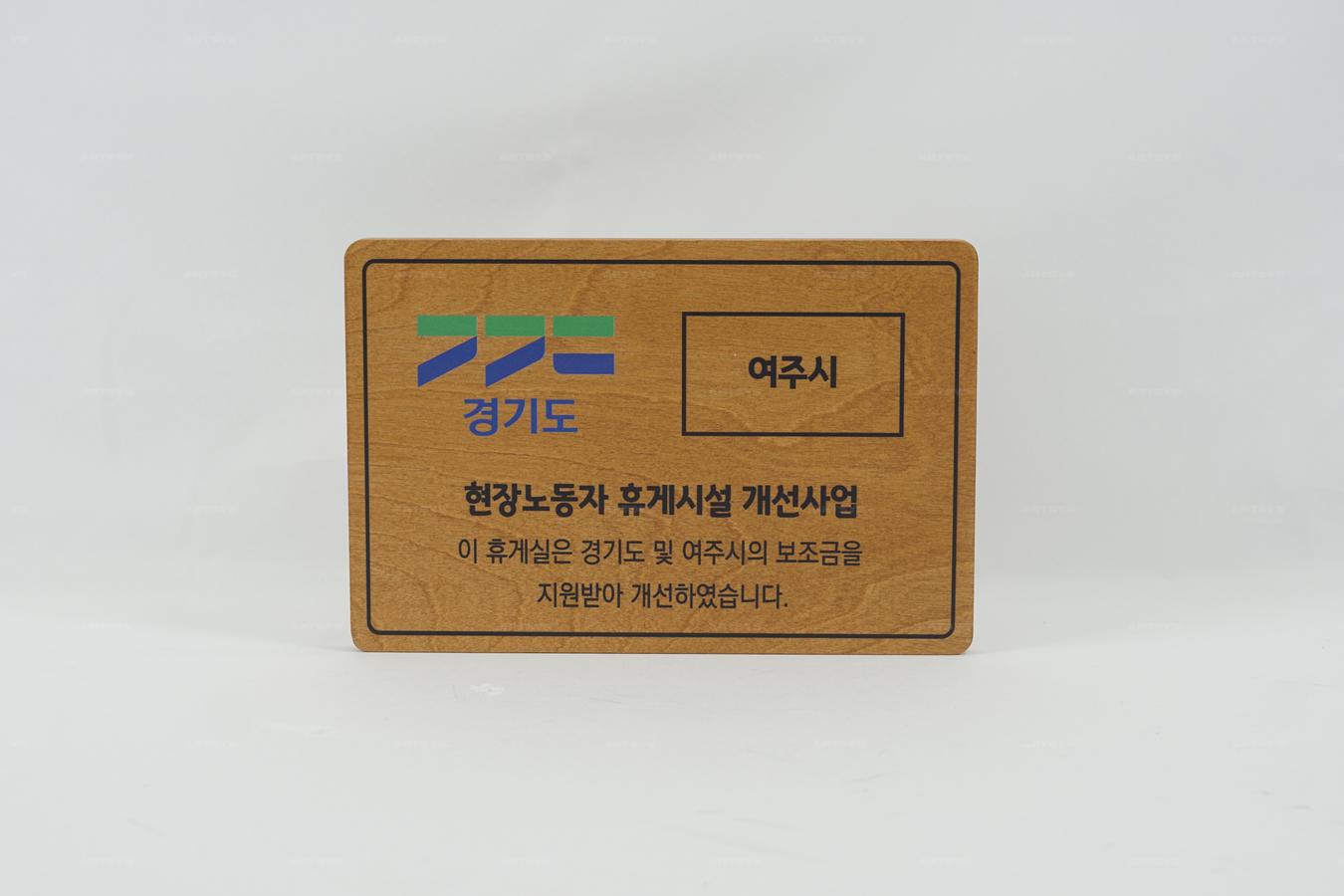 상품 소개 | 여주시에 위치한 현장노동자 휴게시설 개선사업 안내판입니다. 이 안내판은 경기도와 여주시의 보조금을 지원받아 개선된 시설에 대한 정보를 제공합니다. 나무 소재로 제작되어 자연스러운 갈색 톤을 가지고 있어, 따뜻하고 친근한 느낌을 줍니다. 현장노동자들이 편안하게 쉴 수 있는 공간을 알리는 중요한 역할을 하고 있습니다. | ||