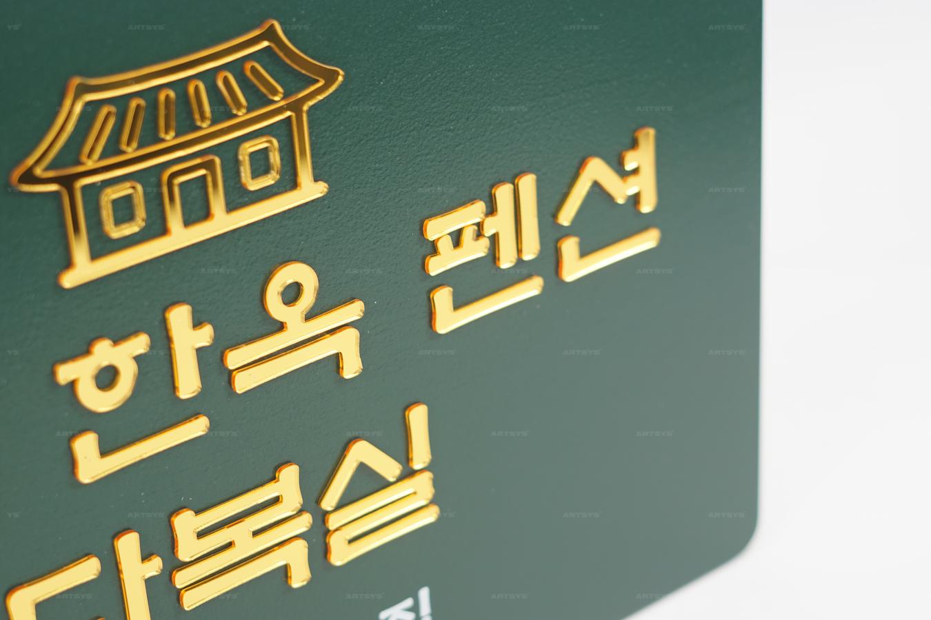 | 상품 소개 | 구례 한옥 펜션 다복실의 간판은 고급 아크릴로 제작되어 내구성이 뛰어나며, 세련된 녹색 배경에 금색 글씨로 고급스러운 느낌을 줍니다. '복이 많은 집'이라는 문구는 손님들에게 따뜻한 환영의 메시지를 전달합니다. 이 간판은 펜션의 독특한 매력을 강조하며, 방문객들에게 잊지 못할 경험을 선사합니다. | ||