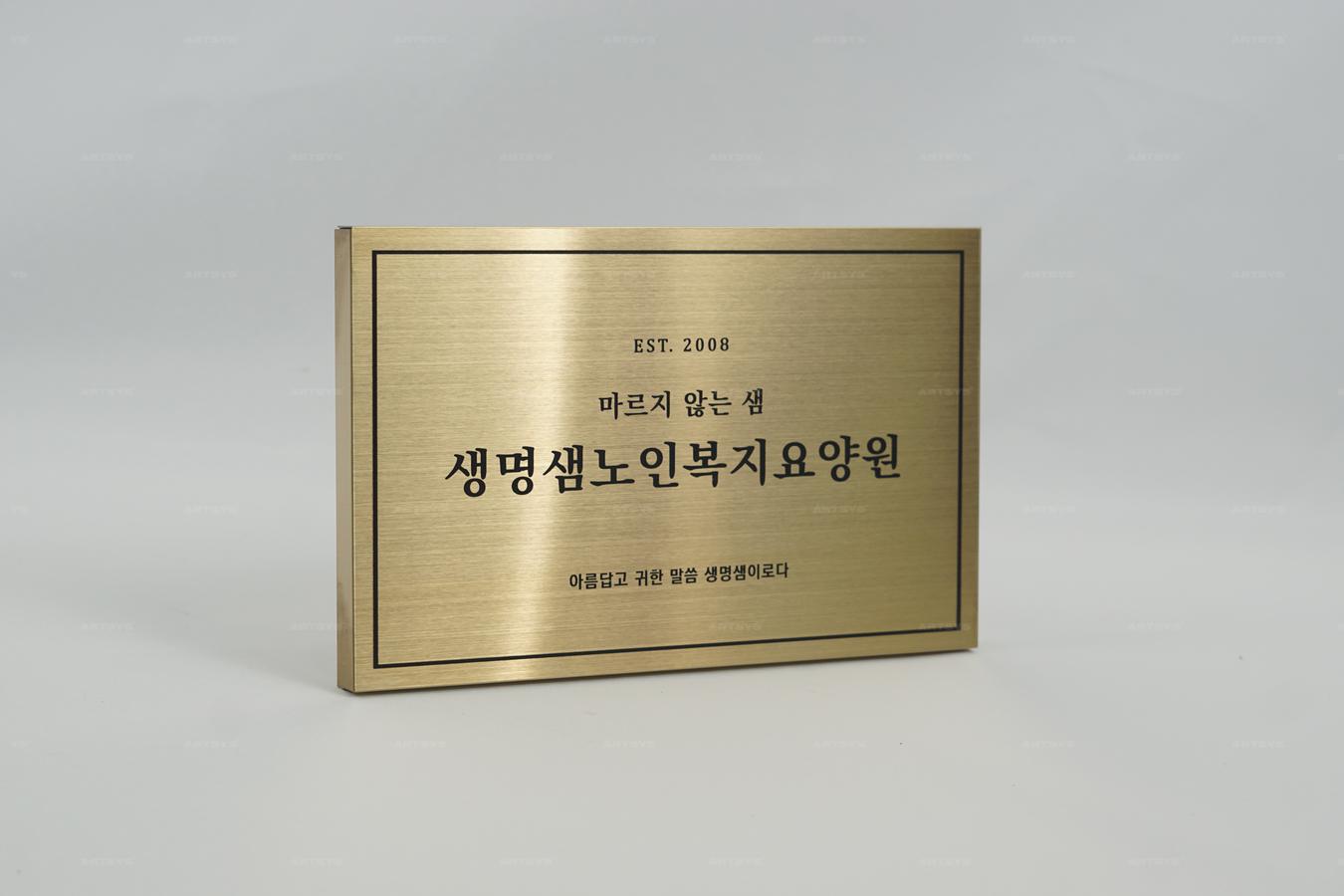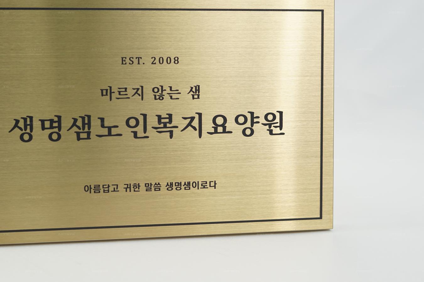 | 상품 소개 | 이 아름다운 금속 입간판은 생명샘노인복지요양원을 위해 제작되었습니다. 고급스러운 골드미러 색상으로, 내구성이 뛰어난 스테인리스 스틸 소재로 만들어져 오랜 사용이 가능합니다. '마르지 않는 샘'이라는 의미를 담고 있으며, 2008년에 설립된 이 요양원은 아름답고 귀한 말씀을 전합니다. 고급스러운 디자인과 튼튼한 소재로, 방문객들에게 긍정적인 인상을 남길 것입니다. | ||