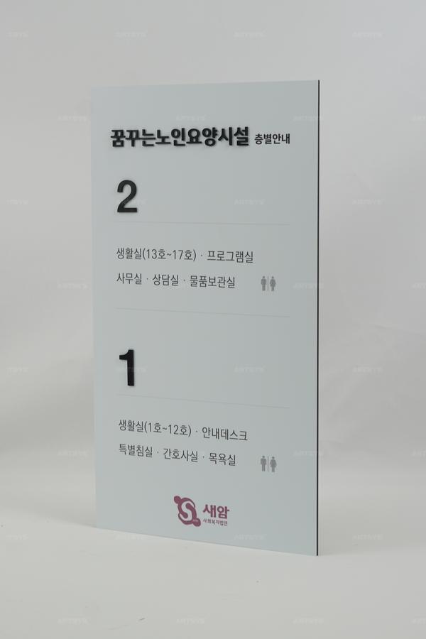 | 상품 소개 | 이 안내판은 꿈꾸는 노인 요양 시설의 충별 안내를 위해 제작된 아크릴 소재의 세련된 디자인입니다. 두 개의 층으로 구성되어 있으며, 각 층의 생활실, 프로그램실, 사무실 등의 정보를 명확하게 전달합니다. 투명한 아크릴 재질은 현대적인 감각을 더하며, 화이트와 연한 블루 색상이 조화를 이루어 깔끔한 인상을 줍니다. 이 제품은 요양 시설의 필수 아이템으로, 방문객들에게 필요한 정보를 손쉽게 제공합니다. | ||