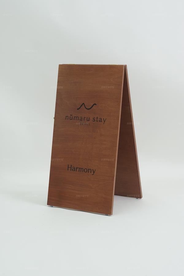 | 상품 소개 | 이 나무 입간판은 nümaru stay 서울의 안내판으로, 고급스러운 갈색 톤이 특징입니다. 자연스러운 나무 질감으로 제작되어 따뜻한 느낌을 주며, 'Harmony'라는 문구와 방향 화살표가 세련되게 디자인되어 있습니다. 고객의 시선을 끌고, 방문객들에게 친근한 인상을 남기는 이 제품은 호텔이나 숙소의 입구에 적합합니다. | ||