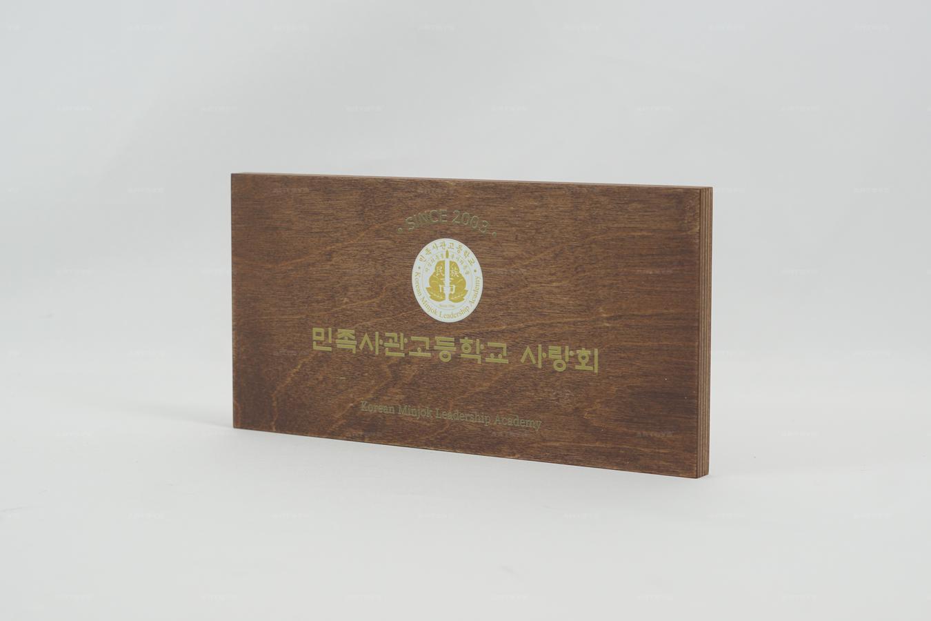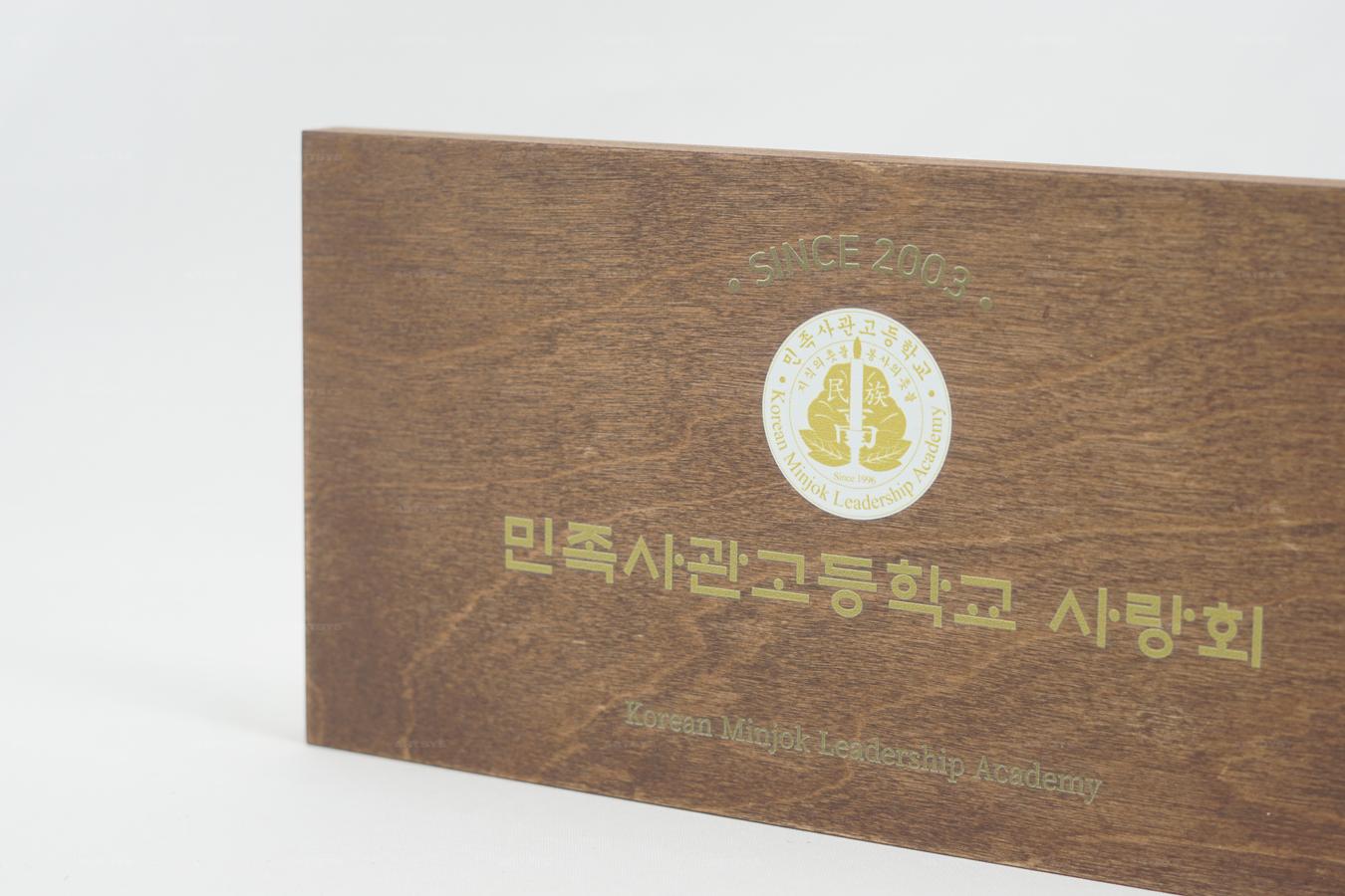 | 상품 소개 | 이 고급 나무 간판은 민족사관고등학교 사랑회를 위해 제작되었습니다. 2003년 설립 이래로, 학교의 정체성과 가치를 잘 전달하는 디자인으로, 자연스러운 다크브라운 색상으로 마감되어 있습니다. 나무 소재의 따뜻함과 고급스러움을 동시에 느낄 수 있는 이 간판은 학교의 명성을 더욱 돋보이게 합니다. 간판 제작 시, 내구성과 세련된 디자인을 고려하여 최상의 품질로 제작되었습니다. | ||