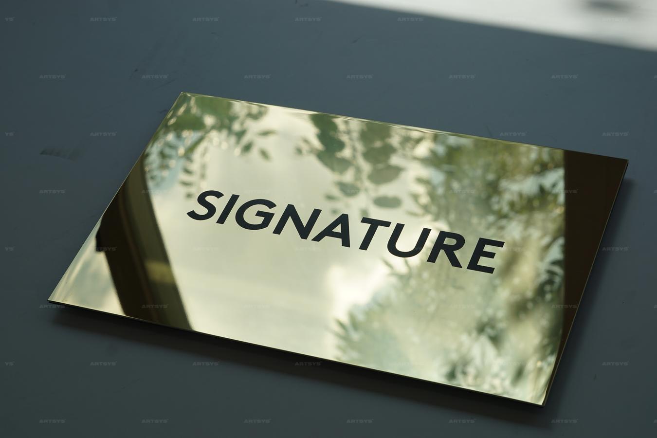 | 상품 소개 | 이 고급스러운 스테인리스 스틸 골드 미러 사인 보드는 'SIGNATURE'라는 텍스트로 세련된 디자인을 자랑합니다. 미러 마감으로 반짝이는 표면이 돋보이며, 어떤 공간에서도 우아함을 더해줍니다. 비즈니스의 품격을 높이는 데 최적의 선택이 될 것입니다. | ||