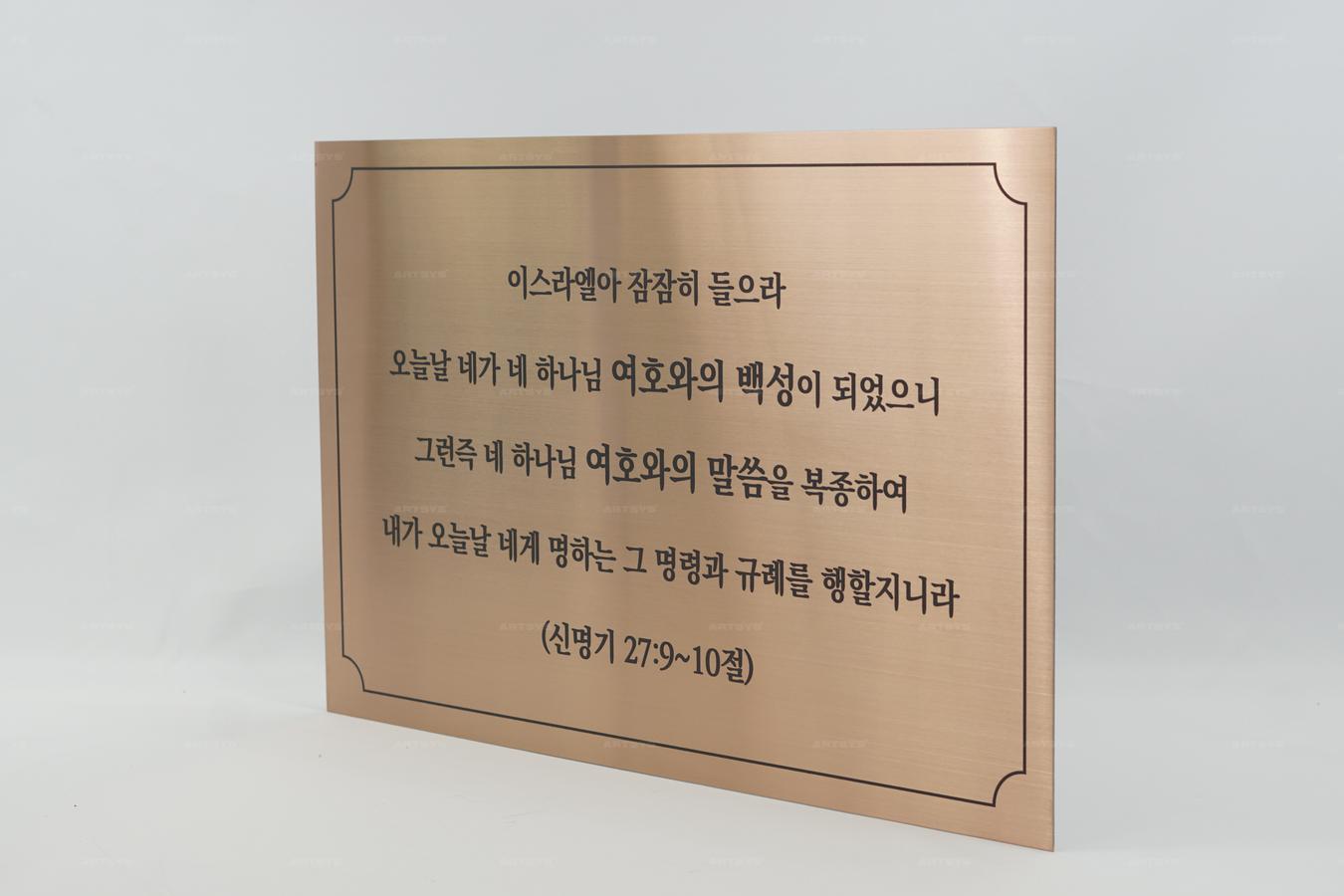 | 상품 소개 | 신명기 27:9~10절을 새긴 스테인리스 스틸 명판입니다. 이 명판은 고급스러운 브라운골드미러 색상으로 제작되어 내구성이 뛰어나며, 종교적 의미를 담고 있습니다. 특별한 날이나 장소에 적합한 이 명판은 기념품으로도 훌륭합니다. 여러분의 소중한 메시지를 담아보세요. | ||