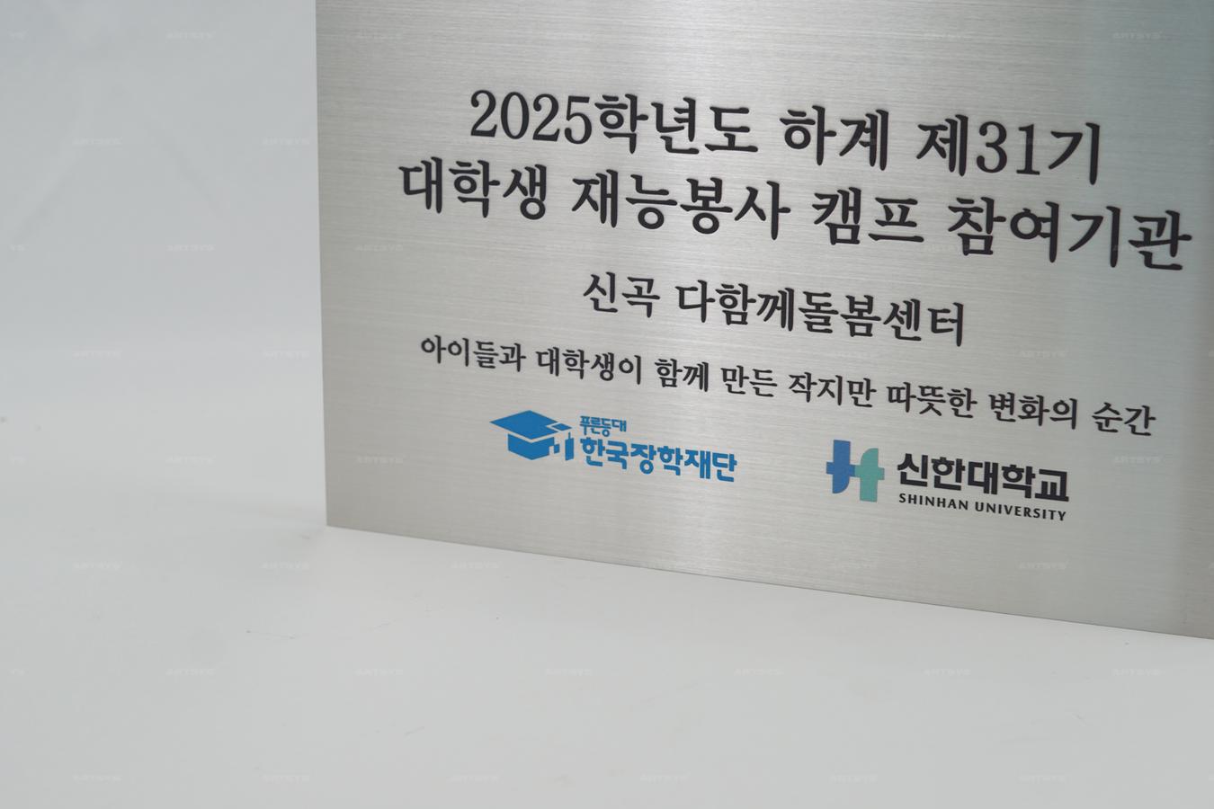 | 상품 소개 | 2025학년도 하계 제31기 대학생 재능봉사 캠프 참여기관을 알리는 스테인리스 스틸로 제작된 안내판입니다. 신곡 다함께돌봄센터의 따뜻한 변화를 상징하며, 실버미러 색상으로 세련된 느낌을 줍니다. 이 안내판은 내구성이 뛰어나고 고급스러운 외관을 자랑하여, 캠프의 의미를 더욱 부각시킵니다. 대학생과 아이들이 함께 만드는 소중한 순간을 담은 이 안내판은 특별한 행사에 적합합니다. | ||