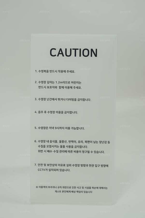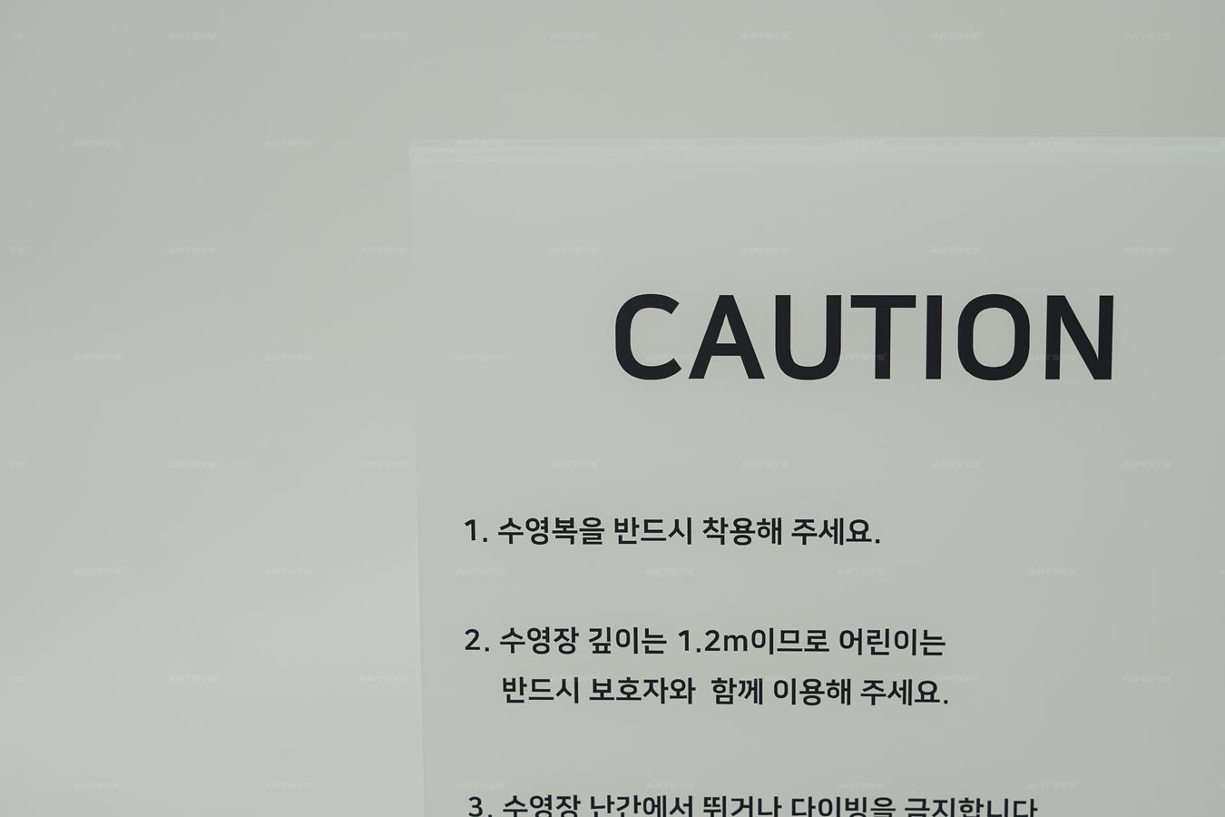 | 내용 | 주의사항 1. 수영할 때 주의해 주세요. 2. 수영장 길이는 1.2m로 이내에는 '안전 보장'을 반드시 확인해 주세요. 3. 수영장 반경에서 뛰거나 다이빙을 금지합니다. 4. 휴식 후 수영장 이용을 금합니다. 5. 수영장은 지정된 위치에서 이용 가능합니다. 6. 수영장 내 소음은, 물, 바람, 유리, 플라스틱 등과 같은 수영장 요인에 영향을 받을 수 있습니다. 7. 일반 보안에 의하여 수영장 성적 정보와 관련하여 CCTV가 설치되어 있습니다. | ||