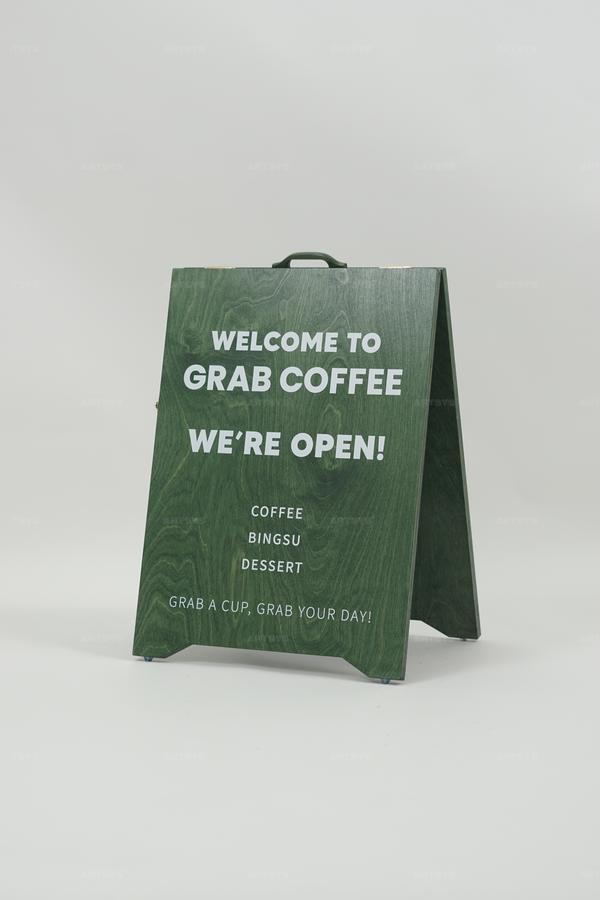 | 상품 소개 | 이 매력적인 우드 입간판은 그랩 커피의 오픈을 알리는 데 최적화된 디자인입니다. 깊은 녹색의 나무로 제작되어 자연스러운 느낌을 주며, 커피, 빙수, 디저트를 제공합니다. 'GRAB A CUP, GRAB YOUR DAY!'라는 문구가 고객의 마음을 사로잡습니다. 우드 사인은 내구성이 뛰어나며, 다양한 실내외 환경에서 사용 가능합니다. 매장 앞에 두면 고객의 시선을 끌어들이는 효과가 있습니다. | ||