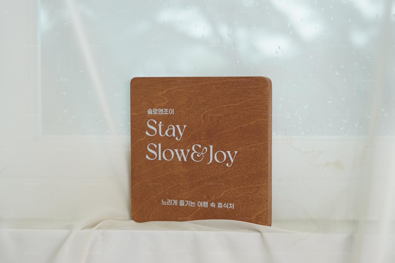 제목 우드 재질의 슬로앤조이 입간판 - 느리게 즐기는 여행 속 휴식처