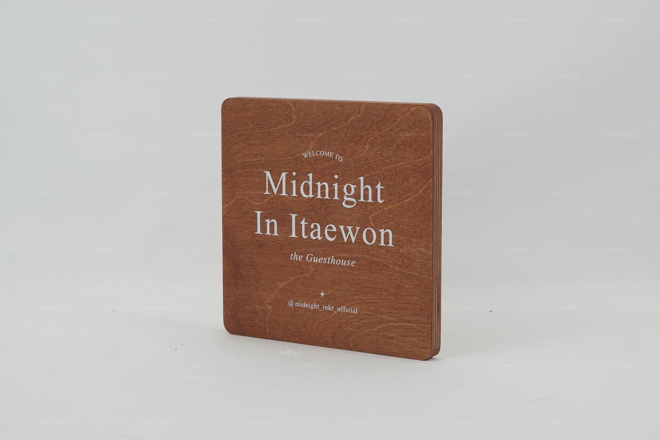 | 상품 소개 | 이태원에 위치한 미드나잇 게스트하우스의 입간판입니다. 나무 재질로 제작되어 자연스러운 갈색 톤이 매력적이며, 방문객들에게 따뜻한 환영의 메시지를 전달합니다. 이 간판은 고급스러운 느낌을 주며, 게스트하우스의 분위기를 한층 더 돋보이게 합니다. | ||