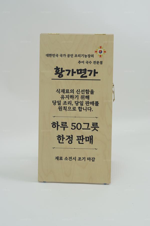 | 상품 소개 | 황가멜가는 대한민국 국가공인 조리기능장이 운영하는 추어 국수 전문점입니다. 신선한 식재료를 유지하기 위해 당일 조리, 당일 판매를 원칙으로 하며, 하루 50그릇 한정 판매로 고객님께 최고의 맛을 제공합니다. 나무 소재로 제작된 입간판은 자연스러운 느낌을 주며, 방문객들에게 신선함을 알리는 중요한 역할을 합니다. 맛있는 추어 국수를 찾는다면 황가멜가를 방문해 보세요! | ||