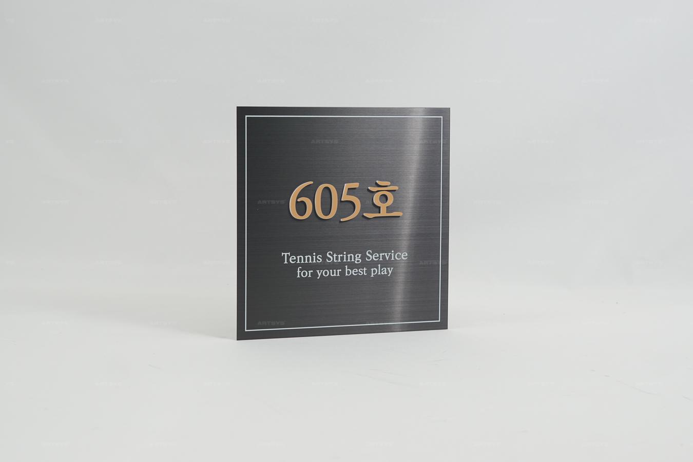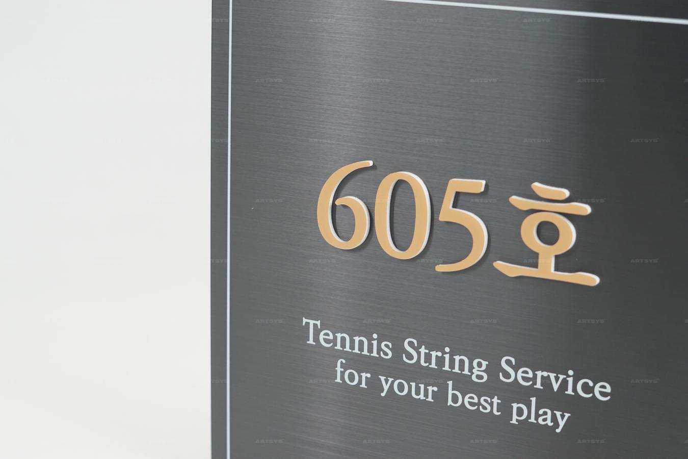 | 상품 소개 | 605호 테니스 스트링 서비스 간판은 세련된 블랙 헤어라인 스테인리스 스틸로 제작되어, 고급스러운 느낌을 제공합니다. 'for your best play'라는 문구가 추가되어 고객에게 최상의 서비스를 제공하겠다는 의지를 담고 있습니다. 이 간판은 테니스 관련 서비스에 적합하며, 눈에 띄는 디자인으로 가시성을 높입니다. | ||