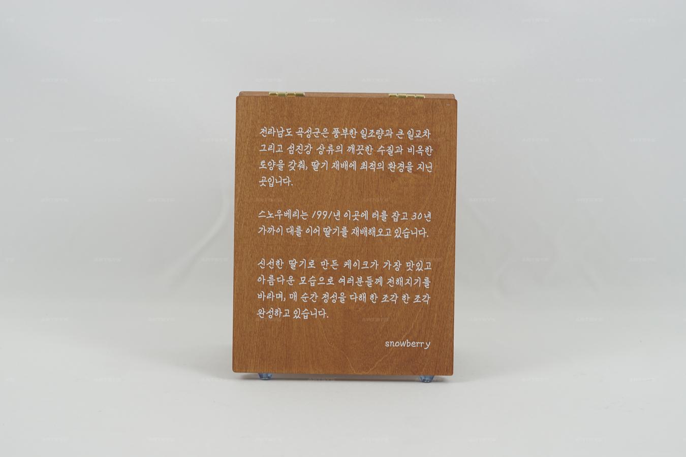 | 상품 소개 | 스노우베리에서 제공하는 신선한 딸기로 만든 케이크는 고객님들께 최고의 맛과 아름다움을 선사합니다. 천라남도의 최적의 환경에서 재배된 딸기를 사용하여, 매 순간 정성을 다해 조리하고 있습니다. 이 우드 입간판은 자연스러운 갈색으로, 스노우베리의 따뜻한 이미지를 잘 표현하고 있습니다. 고객님들의 방문을 기다리고 있습니다. | ||