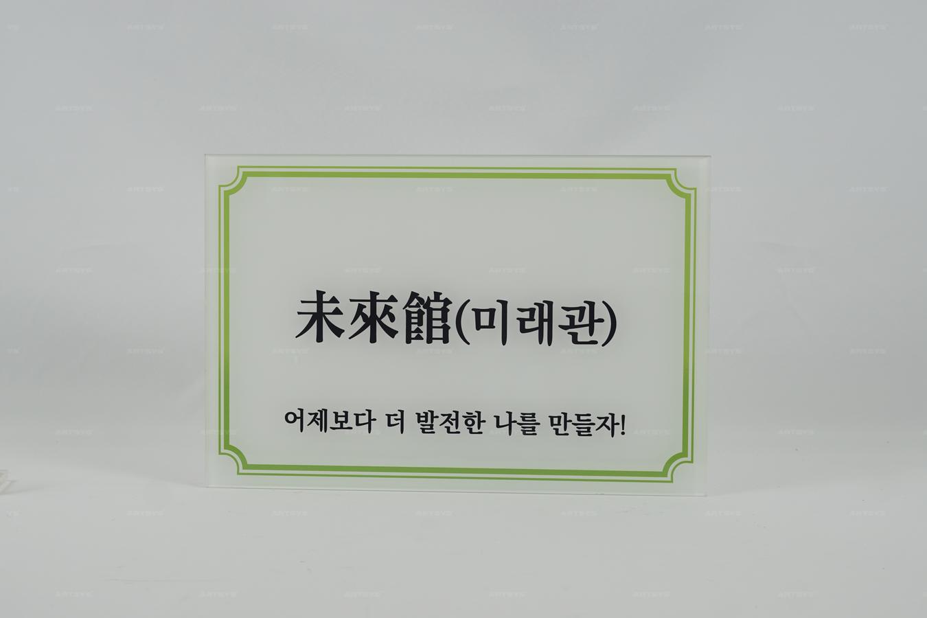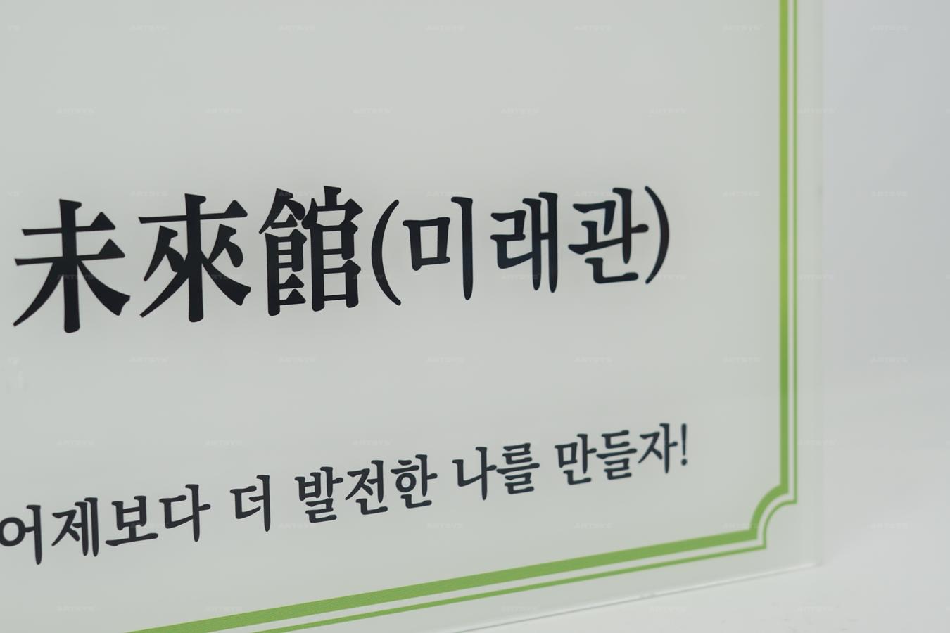 | 상품 소개 | 이 아크릴 안내판은 '미래관'이라는 이름과 함께 '어제보다 더 발전한 나를 만들자!'라는 강력한 메시지를 담고 있습니다. 투명한 아크릴 재질로 제작되어 세련된 디자인을 자랑하며, 어떤 공간에서도 조화롭게 어우러집니다. 이 안내판은 사무실, 교육 기관 등 다양한 환경에서 사용하기 적합하며, 발전과 성장을 상징하는 메시지를 통해 긍정적인 분위기를 조성합니다. | ||