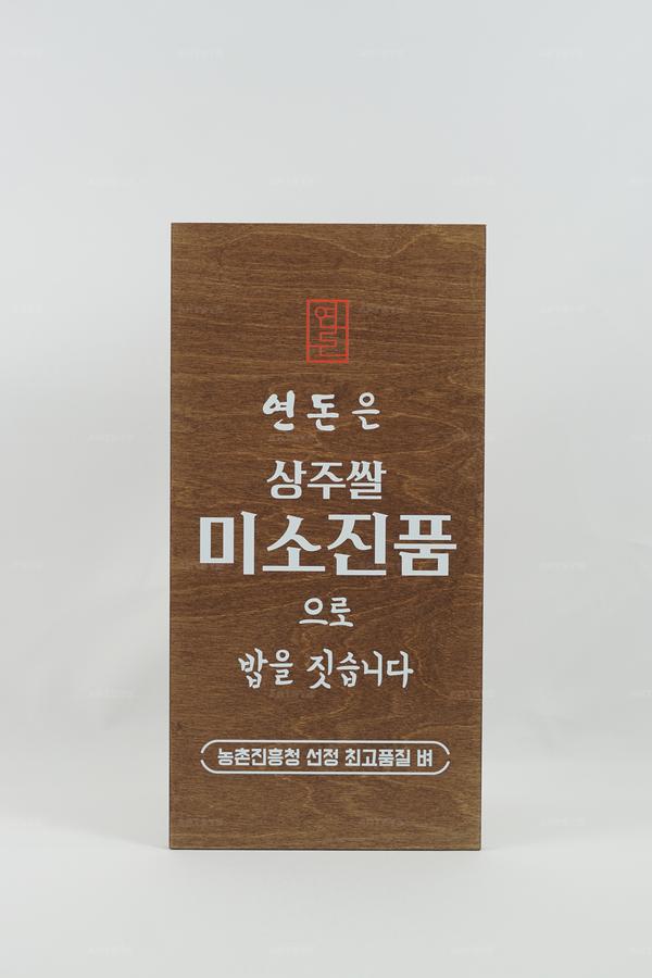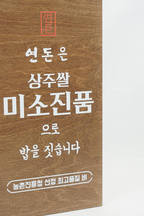 | 상품 소개 | 연돈에서 제공하는 상주찰 미소진품으로 만든 밥은 농촌진흥청에서 선정한 최고 품질의 제품입니다. 나무로 제작된 이 표지판은 고급스러운 갈색의 색감으로 눈길을 사로잡습니다. 최고의 재료로 만든 맛있는 밥을 경험해 보세요. | ||