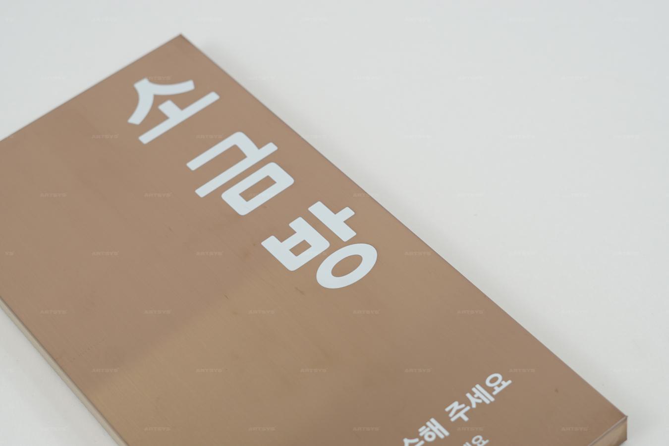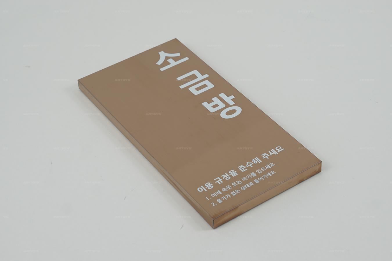 | 상품 소개 | 이 스테인리스 스틸로 제작된 소금방 안내판은 브라운골드미러 색상으로 고급스러운 느낌을 제공합니다. 이용 규정을 명확히 안내하여 고객님의 편안한 이용을 도와드립니다. 모든 내용이 깔끔하게 표현되어 있으며, 내구성이 뛰어난 소재로 오랜 사용이 가능합니다. 소금방의 이용 규정을 준수하여 더욱 쾌적한 환경을 만들어 주세요. | ||
