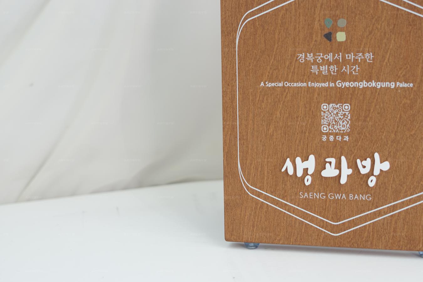 | 상품 소개 | 경복궁에서 특별한 시간을 즐길 수 있는 생과방의 입간판입니다. 나무 재질로 제작되어 자연스러운 느낌을 주며, 갈색 계열의 색상으로 고급스러움을 더했습니다. 고객님들에게 특별한 경험을 선사하는 공간을 소개하는 데 적합한 제품입니다. 입간판으로 활용하여 방문객들에게 매력적인 정보를 제공하세요. | ||