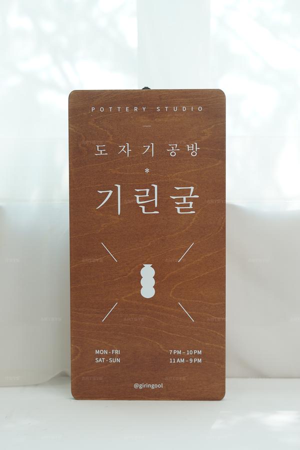 나무 재질의 도자기 공방 기린골 간판