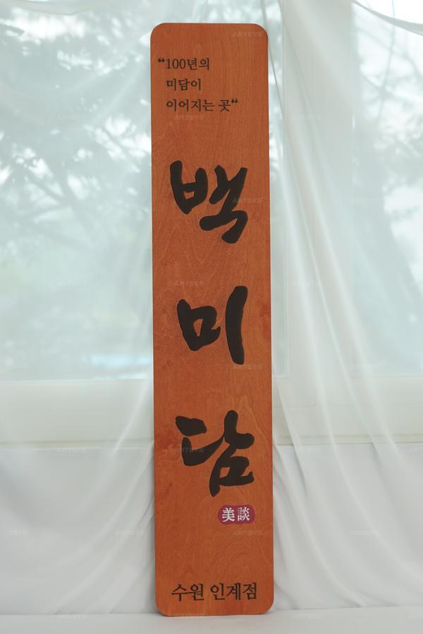 나무로 제작된 벽미담 수원 인계점 간판