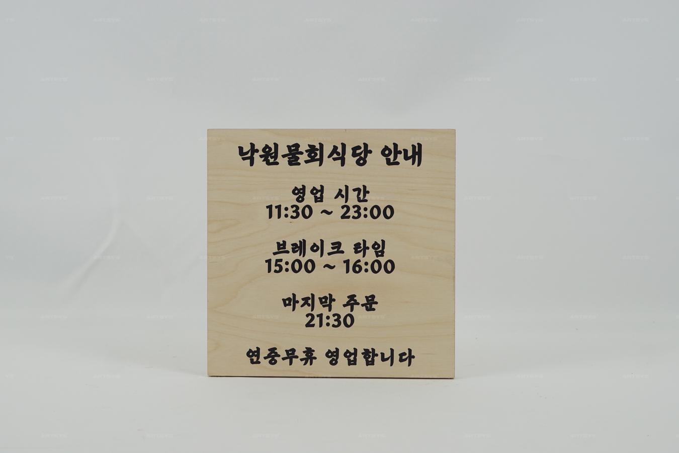 낙원물회식당 안내판 - 나무 재질의 영업 시간 안내